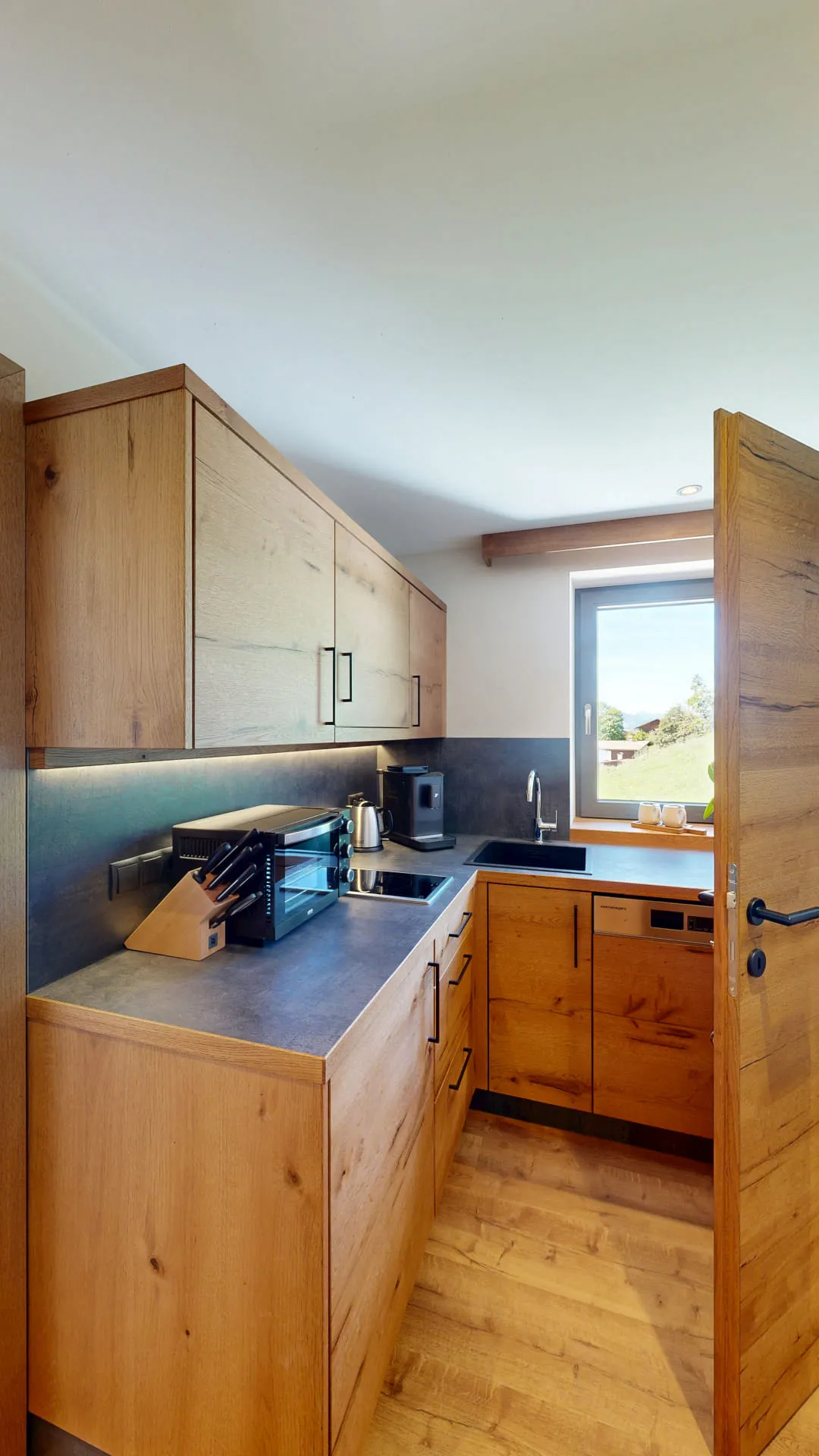 Über den Vorraum gelangt man in die Küche. Diese ist voll ausgestattet mit allem, was Sie benötigen, einschließlich Geschirrspüler, Backofen, Kochfeld, Kühlschrank mit Gefrierfach, Kaffeevollautomat, Wasserkocher und vielem mehr. Das Wohnzimmer ist nicht nur ein Raum der Entspannung mit einem Schlafsofa, sondern auch ein Ort der Unterhaltung mit einem Essbereich. Von dort aus kommt man auf den Balkon, wo man einen atemberaubenden Blick genießen kann.