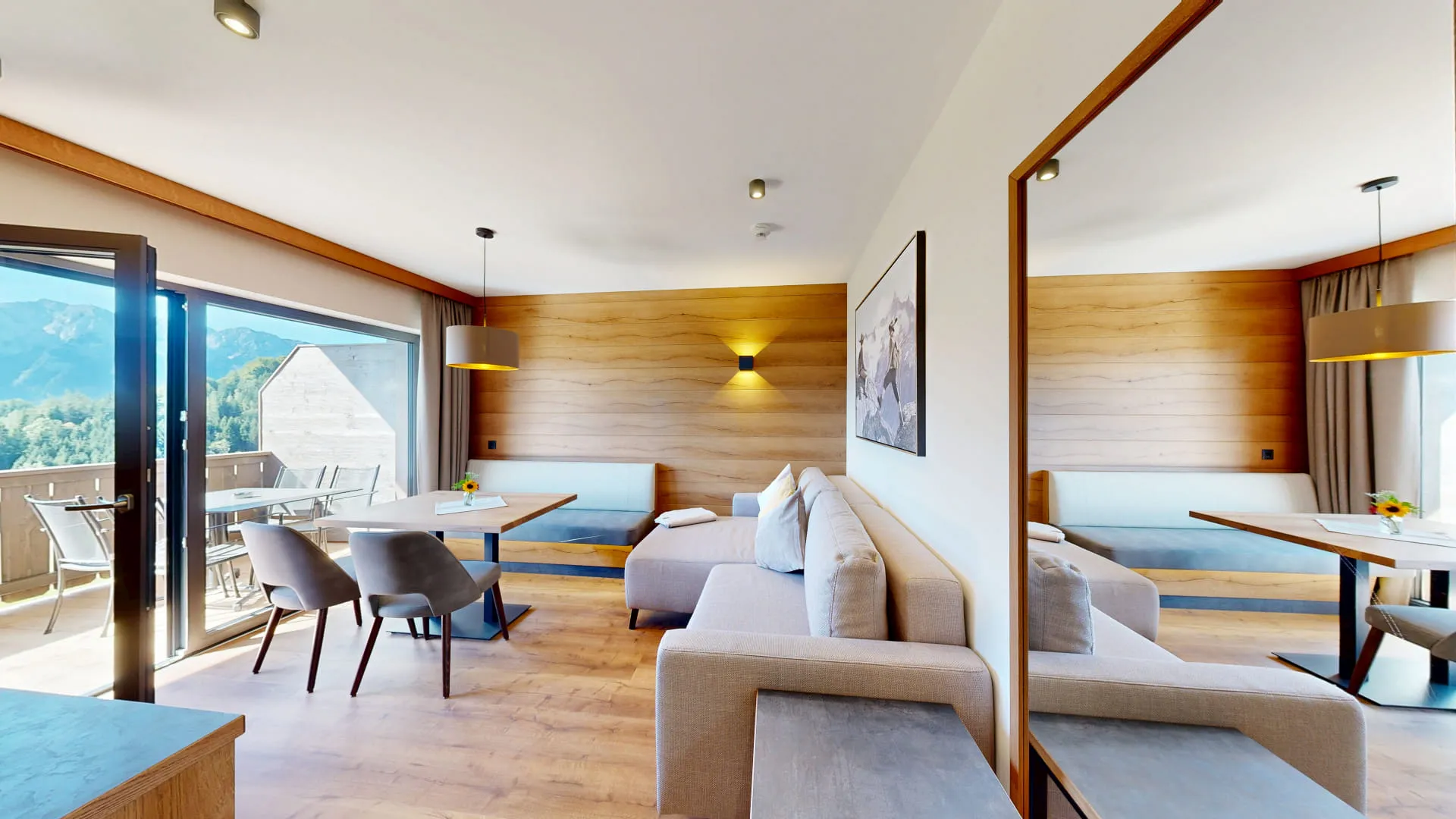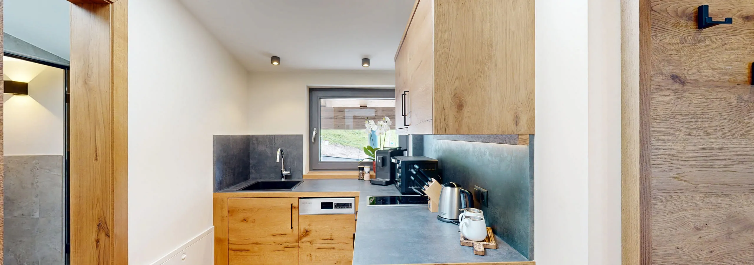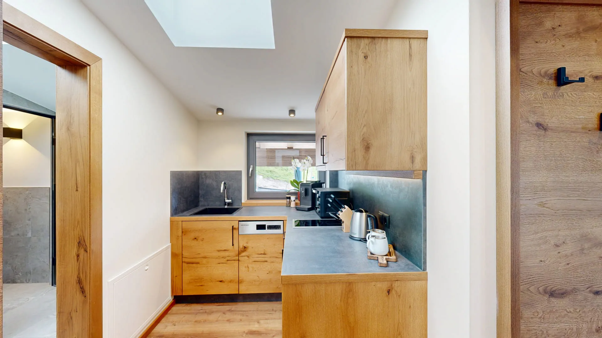 Über den Vorraum gelangt man in die Küche. Diese ist voll ausgestattet mit allem, was Sie benötigen, einschließlich Geschirrspüler, Backofen, Kochfeld, Kühlschrank mit Gefrierfach, Kaffeevollautomat, Wasserkocher und vielem mehr. Der traumhafte Wohnbereich bietet zudem einen gemütlichen Essbereich und ein großes Schlafsofa, die jeweils zum Verweilen und Genießen einladen. Vom großzügigen Panoramabalkon genießen Sie den herrlichen Blick auf die Bergwelt. Ein Schlafzimmer mit einem gemütlichen Boxspringbett und großen Fenstern, die ebenfalls den Blick auf das beeindruckende Kaisergebirge freigeben, ist sicherlich ein Ort der Ruhe und Inspiration. Das moderne Badezimmer ist mit begehbarer Dusche und Föhn, ein separates WC sorgt für zusätzlichen Komfort.