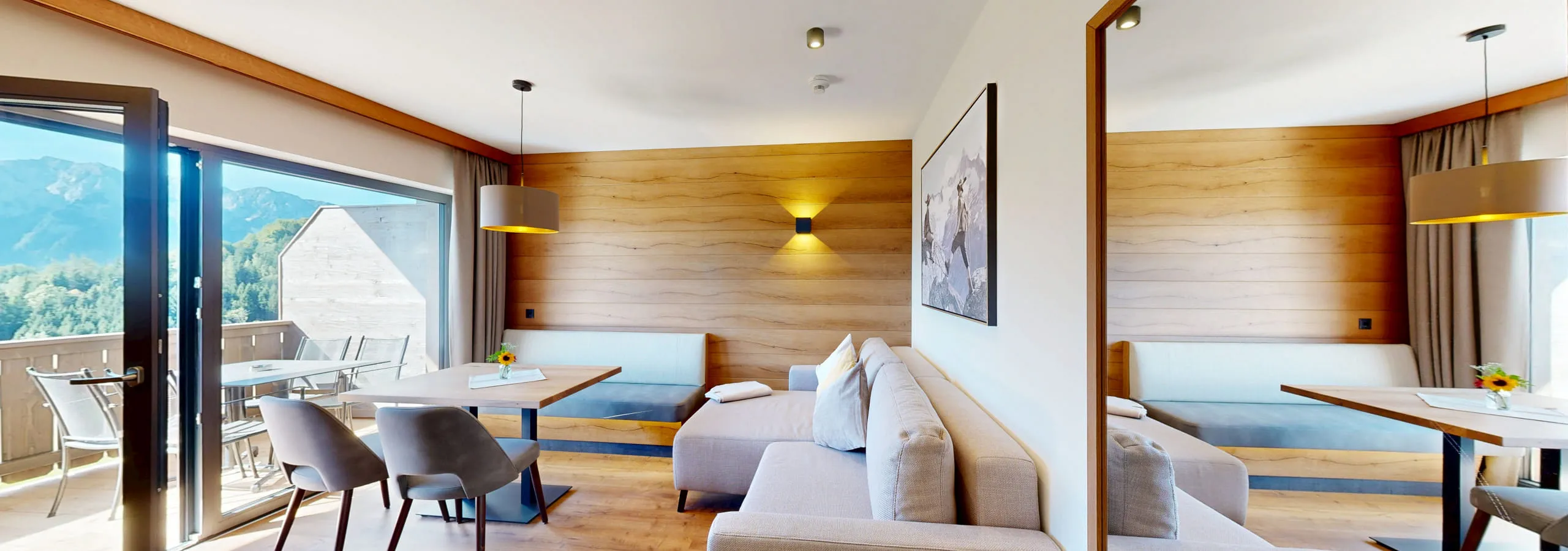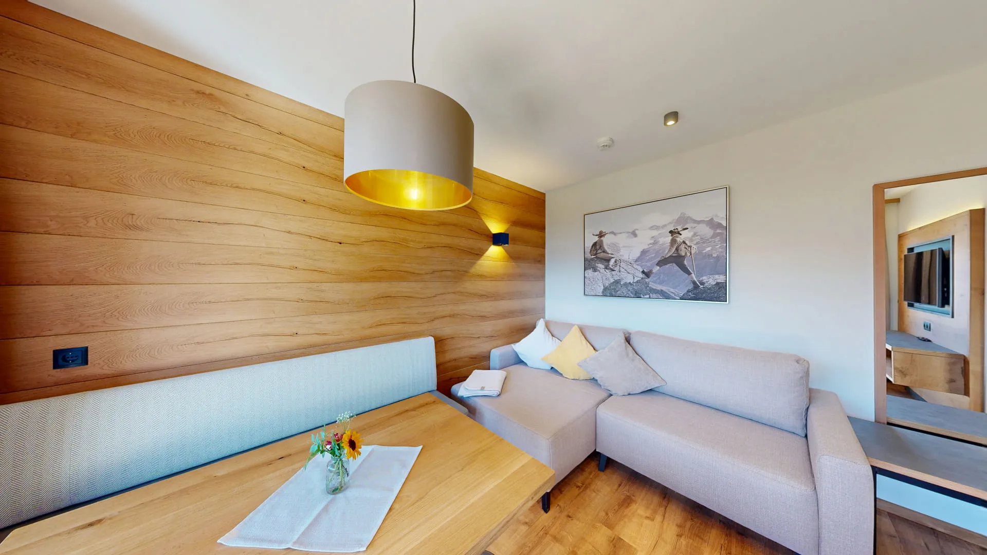 - Wohnzimmer mit Schlafsofa, Essbereich und Flat-TV