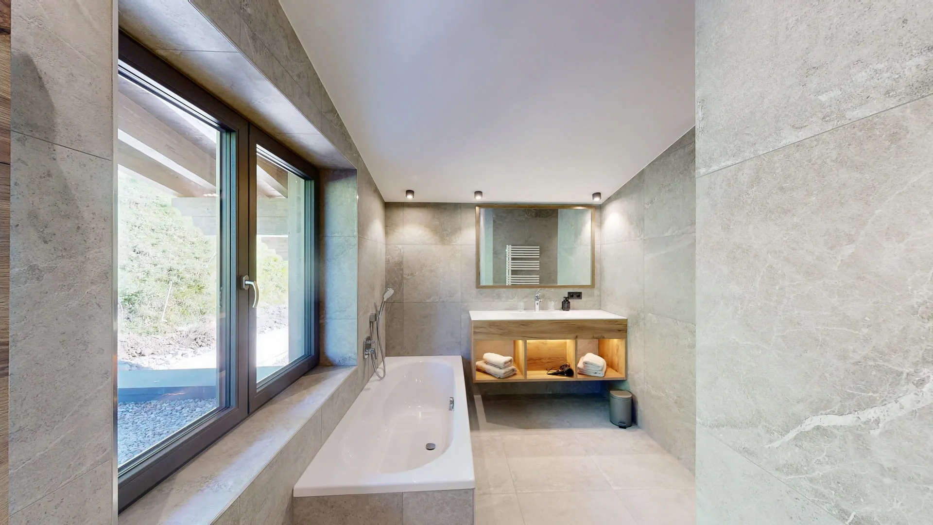 - Badezimmer mit Badewanne, begehbarer Dusche, Waschtisch, Haartrockner, Handtuchtrockner mit Frottierwaren