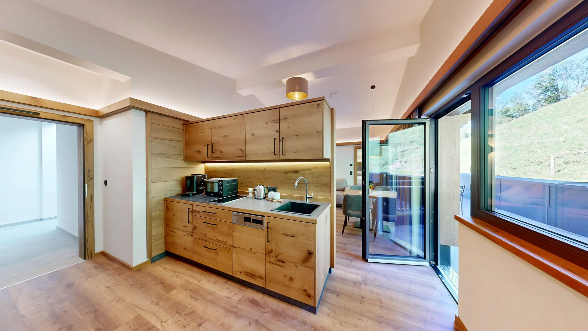 Die Küche im Vorraum lässt keine Wünsche offen. Diese ist voll ausgestattet mit allem, was Sie benötigen, einschließlich Geschirrspüler, Backofen, Kochfeld, Kühlschrank mit Gefrierfach, Kaffeevollautomat, Wasserkocher und vielem mehr. Der traumhafte Wohnbereich bietet zudem einen gemütlichen Essbereich und ein großes Schlafsofa, die jeweils zum Verweilen und Genießen einladen. Das Apartment verfügt über ein großzügiges Bad mit begehbarer Dusche, Badewanne und Föhn. Ein separates WC sorgt für zusätzlichen Komfort. Das Schlafzimmer ist mit Boxspringbett und TV ausgestattet.
